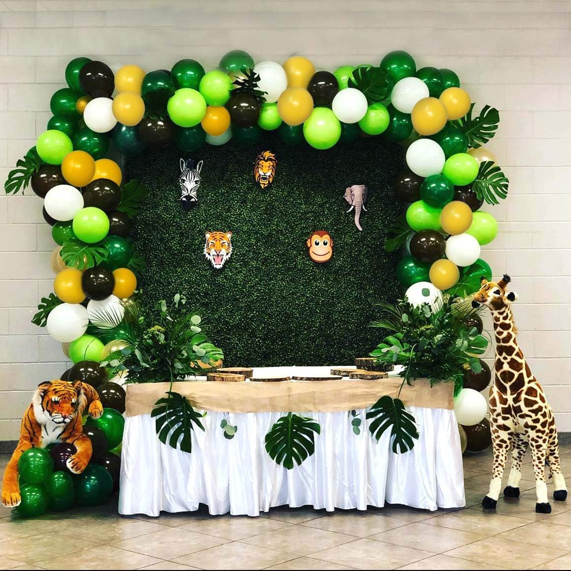 Amazon Com 121pcs Jungle Safari Theme Baby Shower Decorations Balloons Garland Arch Kit Latex Gold Confetti Pastel Green Balloons Palm Leaves For Wild One Birthday Decorations Party Supplies 4 Balloon Tools Toys from m.media-amazon.com I bet you could borrow a few stuffed animals from family and friends? Whether you are having a safari theme baby shower or a jungle party, there are lots of creative ideas and diy projects to create just the right feel for your event. Because the safari theme is very popular for children, you should not be difficult to find all the decorations such as ribbons, balloons, confetti and the plates and cups to go with the safari theme. One of the popular themes for both baby showers and birthday parties is the safari jungle theme. A baby shower safari theme is very popular, and you can find many decoration kits for a very reasonable price. Safari baby shower invitations are decorated with lions, elephants, giraffes, monkeys etc. Glam safari baby shower, gold safari animals baby shower, safari themed party, centerpieces, gold and leafy tablescape, gold jungle animal baby shower. Wild and farm animals baby shower decorations cookies.